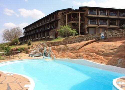 Voi Safari Lodge is a strategically situated safari lodge, in one of the world’s largest game parks – the Tsavo National Park – Voi Safari Lodge stands high above the town of Voi overlooking a vast expanse of the African bush. It is 160km from Mombasa city. You can simply watch the herds of wild animals roam beneath you or you can get closer by a network of access roads reaching into many corners of this 11,666 square kilometre park. From the Lodge, you can look out onto the three water holes and see the ever-changing panorama of Africa unfold right before your eyes and at the same time enjoy the luxury of waiters’ service. There is a special ‘HIDE’ for the camera enthusiasts affording close-up and candid pictures of the wild animals which do not suspect any human presence. This is an ideal spot from which to go out in search of the ‘BIG FIVE’ – Elephant, Lion, Buffalo, Leopard and Rhino. From Voi you have speedy and easy access to either the Tsavo East or Tsavo West portions of this park.